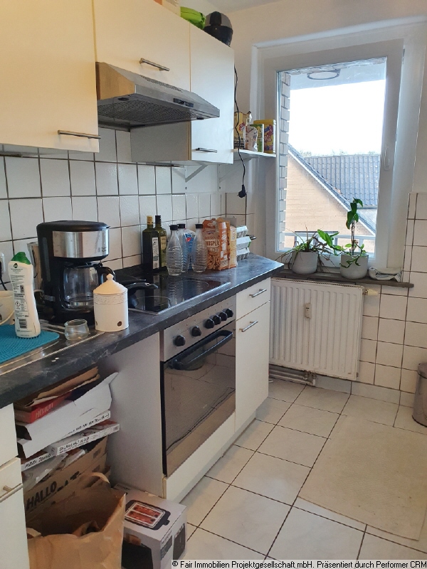 Zu Ihrer rechten Hand gelangen Sie in die Küche, die mit einer Küchenzeile in modernen Farben ausgestattet wurde.